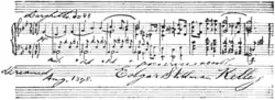 In addition to his work as a composer, Kelley was active as a writer on music, continuing after his early experience with the Examiner in San Francisco. Included in his output were a number of books, including Chopin the Composer and a work on Beethoven.[2] His important article "The Bach-Schumann Suites for Cello" appears in Music: A Monthly Magazine for November 1892, 612-19; he owned a unique copy of the six suites (now lost?). The most notable of his composition pupils was Wallingford Riegger; among his other students were Frederick Ayres, Joseph W. Clokey, James G. Heller, Theodore Holland, Rupert Hughes, W. Otto Miessner, Alexander Russell,[1] and Ella May Dunning Smith.[6]