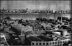 Although the borough is unrecognizable as the industrial town it once was, growing pains have left marks. When the old Alcoa plant site from 1916 began to be converted to condominiums, construction was forced to halt for cleanup of industrial contaminants, including excessively high concentrations of PCBs.[45] In another case, construction of a condominium/shopping center in south Edgewater was interrupted for six months by safety measures to protect workers from chemical exposure in the lead- and arsenic-riddled soil.[26] Next to this structure, behind a chain link fence lies a Superfund site.[42] Operational Hess Oil tanks, beside the derelict Alcoa rolling mill, once the second-largest in the world, are a reminder of the borough's industrial phase. The building, occupying 1,100,000 square feet (100,000 m2) of space, was designed in 1914 and was used to roll ingots of aluminum into sheets that were used to create everything from toothpaste tubes to aircraft frames, before the facility was abandoned in 1967 due to lack of space needed to expand the facility.[52][53][54]