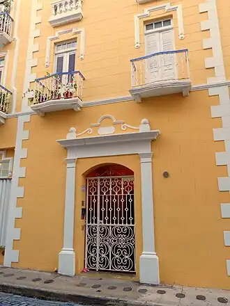 Edificio Patio Español (Spanish for 'building of the Spanish courtyard'), also known as La Filarmónica Building, is a mixed-use building located in the Old San Juan historic district of the city of San Juan, Puerto Rico.[1] It was designed in a Spanish Mission Revival-style by civil engineer Eduardo Fossas López and built in 1937 with the purpose of refilling an emptied lot of the old city with a structure that resembled and referenced the Spanish Colonial architecture around it. Engineer Fossas was hired by Manuel, José and Amalia Vias Torrijos, owners of the lot, sons of the Puerto Rican lawyer and politician Juan Vias Ochoteco who, in 1908, had bought the building that previously occupied that lot. This emptied lot was formerly the site of a meeting house for a group called Sociedad La Filarmónica ('Society of the Philharmonic'), a scholarly club that was founded by Manuel de Elzaburú and Alejandro Tapia y Rivera with the intention of promoting cultural activities in the city of San Juan. The Patio Español building was added to the National Register of Historic Places in 2005.[2]