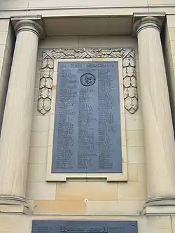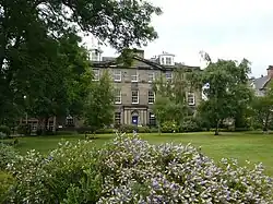 The main building of the Senior School, with its Greek Doric frontage, was designed by architect William Burn.[2] The stone used was principally from the nearby Craigleith Quarry. The Foundation Stone was laid in June 1823 and the school opened for the first session in October 1824. In 1892, new classrooms were built along the western wall of the site, and in 1900, the School Library was opened, followed by the new Science Block in 1909, both along the eastern wall. At the back of the school the Dining Hall, and the Rifle Range beneath it, was opened in 1912 and after World War I, the Gymnasium was built. This was dedicated as a War Memorial to Edinburgh Academicals (former pupils) who had fallen during the hostilities of 1914 to 1918.[3]