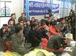 Further spurred by the start of demolition on the afternoon of 12 December 2006, more protesters started gathering spontaneously after workers removed the bell and the clock face from the tower, leaving a big hole. Activists, including "Long Hair" Leung Kwok-hung, rushed into and occupied part of the demolition site, chanting slogans from the roof of an excavator and demanded to meet Secretary for Housing, Planning and Lands, Michael Suen Ming-yeung.[23] Protesters formed a human chain at the entrance of the construction site so as to try to stop the construction crew and machines from further demolishing the site.[24]