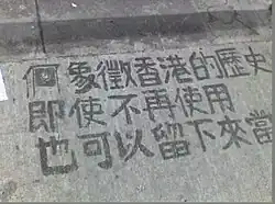 However, the Government had maintained that the Pier and its tower was not old enough to be classified as "historical" and that people were not necessarily "concerned about the building itself".[10] To some extent, it was not wrong, since the activists were mainly fighting for the preservation of a public place and against the methods and urban planning policies of its government, perceived to favour business interests over the public interest. The struggle to preserve the Star Ferry and, later, the Queen's Pier, was the occasion to raise questions on Hong Kong's history, the question of colonialism, and that of democracy in the HKSAR.[14]