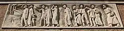 On returning to Budapest, Kiss illustrated her concentration camp experiences in a series of 30 gouache sketches titled Deportation which she exhibited in the city on 22 September 1945. After divorcing her first husband, she married Sándor Kiss and emigrated to the West with him. Shortly after their departure, in July 1948 the four large stone reliefs of the deportation she had created were set in the outer wall of Budapest's Újpest Synagogue.[3] One relief shows a Hungarian policeman directing Jews to cattle trucks for deportation, a second shows an Arrow Cross Party guard overseeing men in a labour battalion, a third presents a Nazi guard herding Jews into the gas chambers and the fourth shows Red Army soldiers being welcomed by Jews in Budapest.[4]