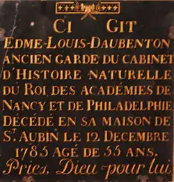 Edme-Louis Daubenton's tombstone is in the church of Saint-Pierre in Avon, Seine-et-Marne.