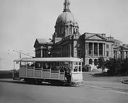In 1893, an ordinance permitting Edmonton to construct and operate a tramway was passed.[1] The concept remained stagnant for the next decade, and Edmonton city council approved the borrowing of $224,000 for the creation of a streetcar system in 1907.[2] Construction of the initial trackway and related infrastructure commenced soon after.[2] The Alberta Legislature passed the Edmonton Radial Tramway Act in 1908, permitting the city to provide tramway service to communities located within 80 miles (130 km) of the city.[1]