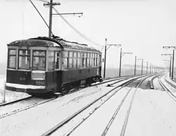 Streetcar service in Calder became isolated from the rest of the streetcar system in May 1948, when the tracks on 124 Street, south of 118 Avenue, were paved over.[5] A small temporary storage yard was constructed at 118 Avenue, and seven passenger cars, a sweeper car, and the library car were parked there before the paving occurred.[5] Buses were used to transport passengers between the Calder stub line and the northern terminus of the Red-and-Green line, which previously ran uninterrupted into Calder.[5] A streetcar was always parked at 118 Avenue to serve as a heated shelter for people waiting either for a bus, or a Calder streetcar.[5] The library streetcar was parked at a small spur on 127 Street, south of 125 Avenue, to serve the neighbourhood of Sherbrooke.[5] Streetcar ridership across the city steadily rose during this time, but noticeably fell after City Council approved a fare increase to address the operating deficit.[5]
