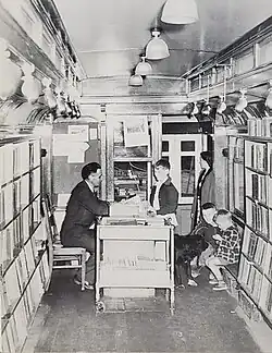 The ERR tried to find ways to help improve the spirits of local residents during the war. Librarian H.C. Gourlay proposed the introduction of a library car, and streetcar No. 14 was converted into a mobile library to serve residents in outlying neighbourhoods.[6] The royal blue streetcar, which had a capacity for 2,000 books and was fitted with wooden bookcases that were secured to its walls, entered service in October 1941.[6] The ERR constructed short sidings in certain neighbourhoods so that the streetcar could park without blocking transit services.[6] On its first day of service, 700 residents visited it in Calder; more than half of them were first-time borrowers, and three quarters were children.[12] By early December, 1941, the streetcar library lent more than 9,500 books, and signed up over 4,000 adults and 1,000 children with new library memberships.[12]