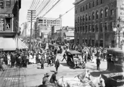 ![]() Jasper Avenue, looking east from 101 Street, circa 1930; all of Edmonton's streetcar lines originated from here. | |
