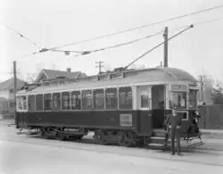 Most streetcars were converted to allow for single-man operations by 1920.[5] In 1917 or 1918, crossovers were installed at both ends of the High Level Bridge, so that streetcars could cross the bridge on the left-hand track.[5] Single-ended streetcars only had doors on their right side, and in the event that people had to evacuate a streetcar while it was on the bridge, driving on the left-hand track allowed for the doors to open onto the middle of the bridge deck, instead of its edge.[5] Some streetcars remained double-ended, but were only operated by one person.[5]