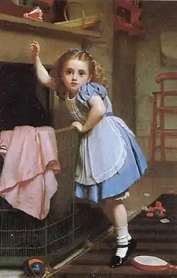 Edmund Eagles (active between 1851 and 1877) was a British painter. He grew up at Hanenfield Lodge, Great Missenden, Buckinghamshire and lived in London 1866 to 1869. His works include “The Little Prisoner”, “Come in my Child”, “The way to make a Pancake” and “The Hobby Horse”. 18 of his paintings are exhibited at the Royal Academy of Arts.[1]