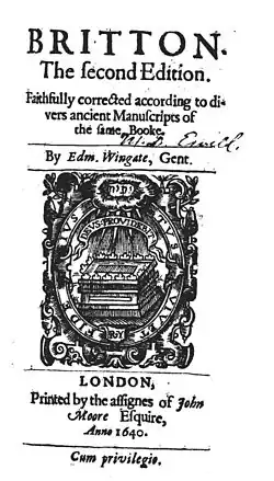 - ^ a b Britton. The second Edition. Faithfully corrected according to divers ancient Manuscripts of the same Booke. By Edm. Wingate, Gent. (2nd ed.), London: Printed by the assignes of John Moore, Esquire [Miles Fletcher, John Haviland and Robert Young], 1640, OCLC 79739905.