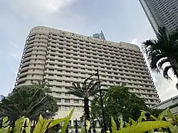 The resort was designed by Kanko Kikaku Sekkeisha of Tokyo and R. Villarosa Architects,[2] with BF Corporation as the main contractor.[11] and features two white towers set in a tropical garden amongst the mostly residential Ortigas Center. The floors of the hotel are marble, while the interior includes Asian paintings and floral arrangements. The Tower Wing is coloured brown and red with cityscape views, while the Garden Wing has views over the landscaped gardens.[12]