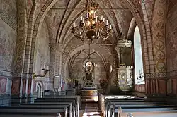 The oldest part of the church is the nave, which was built in fieldstone during the 13th century. The sacristy was added during the 14th century and the choir was enlarged, with added details in Brick Gothic style, during the 15th century. Unusually, the church has preserved its northern wall without windows. Most medieval churches in the area originally lacked windows in their northern façade, but normally windows were opened during the subsequent centuries. Northwest of the church stands the bell tower which was erected in the middle of the 17th century. The interior is decorated with frescos added in the 17th century. They were paid for by the Lilliesparre family, owner of nearby Kragsta Manor. Among the church fittings is the 13th century baptismal font of sandstone with a base of limestone. [2]