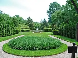 The estate's gardens were designed by landscape architect Jens Jensen with his traditional 'long view,' giving visitors a glimpse of the residence down the long meadow after the passing the entry gates, then brief partial views along the long drive, and only at the end revealing the entire house and another view back up the long meadow.[16]