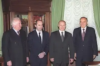 Shevardnadze had to face many enemies. Like Gamsakhurdia, Shevardnadze had to deal with Russian-backed violent separatists in the Georgian provinces of South Ossetia and Abkhazia.[32] The Georgian Civil War between supporters of Gamsakhurdia and Shevardnadze broke out in western Georgia in 1993 but was ended by Russian intervention on Shevardnadze's side — following his decision to join the Russian-led Commonwealth of Independent States in October 1993[42][35] — and the death of ex-President Gamsakhurdia on 31 December 1993.[43] Accepting Russian support undermined Shevardnadze's nationalist creditentials.[39] Shevardnadze survived three assassination attempts in 1992, 1995, and 1998.[35] He escaped a car bomb in Abkhazia in 1992.[34] In July 1993, Shevardnadze narrowly escaped a shelling by Abkhaz separatists in Sukhumi.[44] In August 1995, he survived another car bomb attack outside the parliament building in Tbilisi.[45] In 1998, his motorcade was ambushed by 10 to 15 armed men; two bodyguards were killed.[34]