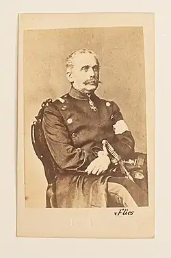 In the Austro-Prussian War, Flies was initially the leader of the combined cavalry brigade of the Army of the Main. Here he received orders from General Edwin von Manteuffel to lead a detachment consisting of five battalions with 8150 infantrymen, 225 cavalrymen and 22 guns to Gotha via Magdeburg and Halle. He was supposed to pursue the withdrawing Hanoverians and prevent them from retreating. Despite being heavily outnumbered Flies ordered the Battle of Langensalza on 27 June 1866. Flies suffered a breakdown during the battle and lost almost 1/5th of his troops. The battle ended with a victory for the Hanoverians, but at this point they were surrounded by Prussian troops and, due to the supply situation, were no longer able to continue fighting.[3] Historian Robert M. Citino considered the battle "one of the senseless frontal attacks in military history".[4][5]