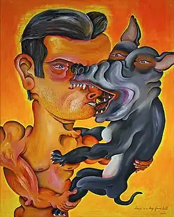 From the formal standpoint, the work of Sarmiento is strident. Colors scream. The glowing orange, yellow and red, far from toning down with the blue and purple, spread out in their entire splendor tempting us to contagious. There is much of the French Fauvism in these explosive colors where dare is essential. Then, the semantic analogy emerges: Fauve in French means wild beast. The capricious detail becomes an indispensable key for the understanding of Sarmiento's artwork that is mostly a unique bestiary through which the artist recreates mythological characters inspired in our daily life: The truth to our innermost fantasies and desires. (Janet Batet, 2010)[8]