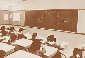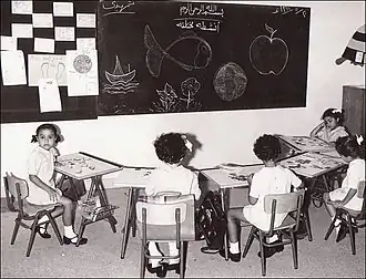 In 1926 the country's first Department of Education was established by king Abdulaziz bin Abdul Rahman Al Saud.[14] Through his reforms the number of schools and kuttabs started growing as well as the number of students that were enrolled.[16] In 1951 this number had risen to 29,887 students and 226 schools.[17] In 1957 the King Saud University was established, this was the first university in the country. In 1964 the first government school for girls was established.