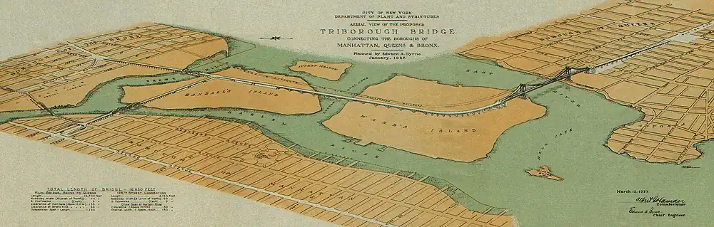 Byrne was greatly preoccupied with the study of traffic facilities. As far back as 1916, he conceived the idea of the Triborough Bridge to link the Boroughs of Manhattan, Bronx, and Queens. He fostered this idea until he thought the time was ripe for its materialization. The actual work on the foundations and anchorages was begun in 1929 under his direction, while he was the Chief Engineer of the Department of Plant and Structures.