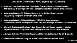 In 2024 for the Adamson Collection/Wellcome Collection with completed transfer of a number of 3D objects from the ACT collection of 1000 painted found objects by Gwyneth Rowlands and 250 pieces by other makers. By the end of 2024 300 Gwyneth Rowlands' painted flints will be on long-term loan to the new building at Maudsley Hospital, New Douglas Bennett House.[19]