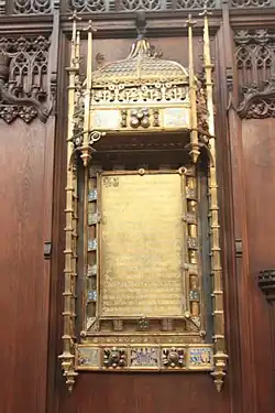 His public memorial, an imposing 7.3m high Celtic cross in Shap granite with bronze sculpted panels, is on Princes Street in the grounds of St John's, Edinburgh, facing Charlotte Street. It was designed by the architect Robert Rowand Anderson and built by Farmer & Brindley of London. The bronze panels are by F. A. Skidmore. It was erected in 1879.[7]