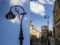 From 1903, the 200 gas lamp standards erected by Cockey in Frome were converted to electricity, after a generating station was built and cables laid.[35] They were then fitted with a replacement art nouveau leaf pattern lampholder. Over 60 survive today, not all with the leaves, some with obtrusive modern lights, a number in poor condition of paintwork. Over 20 are listed Grade II by Historic England and attributed to Singer; a specimen entry illustrating the attribution is the one for the lamp post in front of No 9 Whittox Lane, near the centre of the town.[36] Not all of the standards are Cockey originals. The town refers to them as 'Cockey Lamps' but records of Frome Urban District Council meetings suggest the art nouveau lamp heads were designed by Singer.
