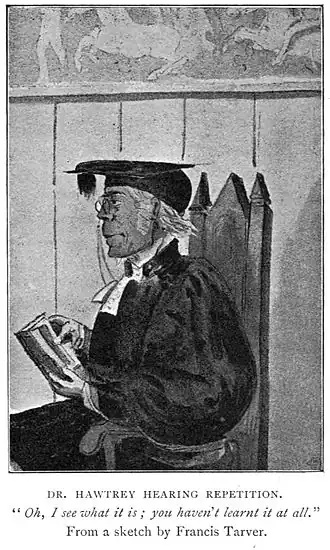 Hawtrey was born at Burnham, Bucks, the son of the vicar of the parish. He was educated at Eton College and King's College, Cambridge,[2] and in 1814 was appointed assistant master at Eton under John Keate. In 1834 he became headmaster of Eton, which role he performed until 1853, when he was elected Provost of Eton following the death of Francis Hodgson. While he was headmaster and Hodgson was Provost, new buildings were erected, including the school library and the sanatorium, the college chapel was restored, the Old Christopher Inn was closed, and the custom of Montem, the collection by street begging of funds for the university expenses of the captain of the school, was suppressed.[3]
