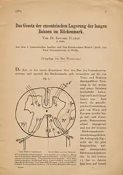 His law played an important role in the initial studies of the spinal cord. With the Berlin neurobiologist Johannes Gad, Flatau performed experiments on dogs and criticized the Bastian-Bruns law concerning the loss of function following spinal cord injury (1893). On the basis of numerous clinical spinal cord surgeries, experiments, and subsequent observations, he discovered that the "greater the length of the fibres in the spinal cord the closer they are situated to the periphery" (Flatau's law). He provided evidence for the laminar arrangement of spinal pathways. [27] He also described the fifth, seventh, and eighth cranial nerves, and carefully outlined their nuclei. The paper on this topic, Das Gesetz der excentrischen Lagerung der langen Bahnen im Rückenmark, was published in 1897. For this work he received a PhD in medical sciences in Moscow in 1899 (dissertation Zakon ekstsentricheskago raspolozheniia dlinnykh putei v spinnom mozgu). [28] This work was presented in 1949, next to a portrait of the author, on display at the IV International Congress of Neurologists in Paris.[14]