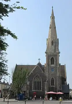 This church was built between 1852 and 1854. It has a three-stage tower (with ashlar spire that was added later) and is dressed with knapped flint and stone. The interior has carved corbels[16] In the 1850s Robert William Edis was apprenticed to the brothers.[17]