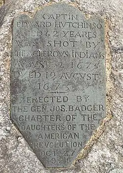 With some reinforcements, they eventually escaped from Brookfield, and Wheeler later recounted Hutchinson's fate: "We came to Marlborough on 14 August when Capt. Hutchinson being not recovered of his wounds before his coming from Brookfield, and over-tired with his long journey, by reason of his weakness, soon grew worse, and more dangerously ill, and on the 19th day of the same month, died, and was there the next day after buried..."[18] He was buried in the town cemetery, now the Springhill Cemetery, where a marker was erected in his honor in 1926. Commenting on his giving his life for the cause of the Massachusetts colony, historian Oliver Roberts noted that "he, who, with his mother, was persecuted, poured out his blood in the service of that uncharitable country."[11]