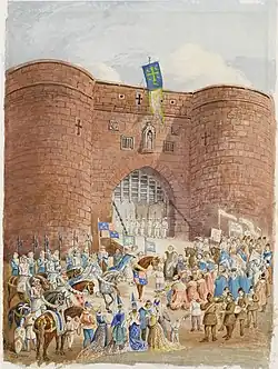 Backed by wealthy Flemish merchants, in March 1471 Edward landed near Hull, close to his estates in Yorkshire. Supporters were reluctant to join him; the important northern city of York opened its gates only when he claimed to be seeking the return of his dukedom, like Henry IV seventy years earlier. The first significant contingent to join was a group of 600 men under William Parr and James Harrington.[46] Parr fought against the Yorkists at Edgecote in 1469 and his defection confirmed Clarence's decision to switch sides; as they marched south, more recruits came in, including 3,000 at Leicester.[47]