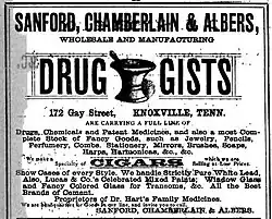 Toward the end of the war in 1864, Sanford formed a drug company, E.J. Sanford and Company.[1] In 1872 this company consolidated with a business established by Hiram Chamberlain and A.J. Albers to form Sanford, Chamberlain and Albers. In subsequent years, this company grew to become one of the largest pharmaceutical companies in the South.[3]