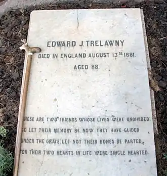 Trelawny was able to visit Augusta Draper in 1874. He also visited Jane Williams in 1872. Williams was the only close friend of Percy Shelley to outlive Trelawny.[192] In August 1881 he suffered a fall while out on a walk. He was bedridden and died two weeks later.[193] His ashes were buried in Rome in a plot of ground adjacent to Percy Bysshe Shelley's grave. He had purchased this plot in 1822 at the time he had arranged for Shelley's ashes to be reburied in a more suitable site within the Protestant Cemetery.[182] At his request his grave marker bears a quote from Shelley's poem "Epitaph".[194]