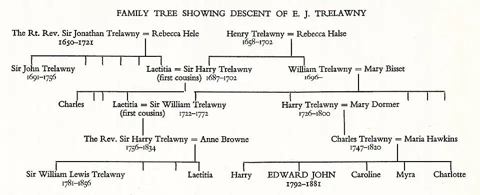 Edward had five siblings who survived to adulthood and several who died as children. Edward shared a disdain for his father with his siblings. Though he hated his father, Edward was close with his mother. His mother worked hard to find wealthy husbands for her daughters, to the extent that her actions were satirised by some. In addition, many people found her to be a disagreeable person as she grew older.[6] Trelawny's parents regarded their children as potential sinners and frequently used harsh measures to try to instill a sense of discipline in them. He resented being treated in this manner.[8][9]