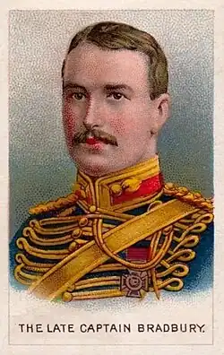 Born in August 1881, in Altrincham, Cheshire, he was the son of James Kinder Bradbury and Grace Dowling. He attended the Royal Military Academy, Woolwich, as a cadet, passing out to join the Royal Artillery as a second lieutenant on 2 May 1900.[1] He was promoted to full lieutenant on 3 April 1901,[2] and in January 1902 was seconded for service with the Imperial Yeomanry in South Africa for the Second Boer War,[3] and appointed a lieutenant with the 31st Battalion.[4] The war ended six months later, and Bradbury resigned his appointment in the Imperial Yeomanry in November 1902,[5] returning to the Royal Artillery,[6] and left Port Natal for Aden on the SS Dominion the same month.[7] He was posted to the 127th Battery RFA in 1904.[8]