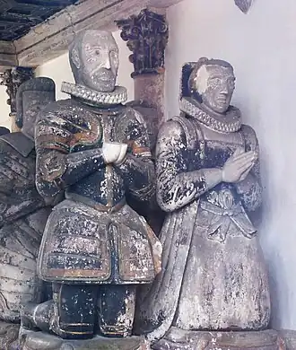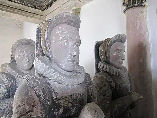 The dates of death for Dame Susan (who died first) and Sir Edward vary slightly between the tomb inscription (2 and 3 October), the printed epitaph and the funeral certificate (3 and 4 October). They were buried in St Mary's church, Denham on 5 October 1605, and Sir Edward was succeeded as heir by his elder son Edward Lewknor.[54]