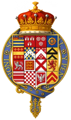 At Bottesford Church in Leicestershire there is the tomb commemorating the third Earl and his wife. It was created by Gerard Johnson the elder of Southwark, a Flemish craftsman. Earl Edward lies on a mat, wearing full plate armour. Instead of a gorget protecting his throat he wears a ruff. He wears the Order of the Garter on his left leg. His coronet has disappeared and at his feet is a decorated bull crest. Countess Isabel, daughter of Sir Thomas Holcroft, KT, wears a ruff with the usual dress of the time under an ermine-trimmed mantle, her head supported by a cushion. Her only daughter, Elizabeth, kneels at her feet. The inscription on the tomb lists the Earl's activities in the Scottish "troubles" of the time.[3]