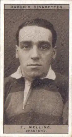 "E. Melling' Bradford (Northern Rugby league.) Born in Wigan in 1900, Edward Melling has proved himself a great utility player. His natural position is scrum half, but he can adapt himself to any position in the back division. He first played for Batley, but Bradford were keen to secure his services, and he went to them and has been one of the mainstays of the team. He has been the leading scorer in the last two seasons. In the season 1926-26 he missed only one out of 47 League and Cup matches" [1]