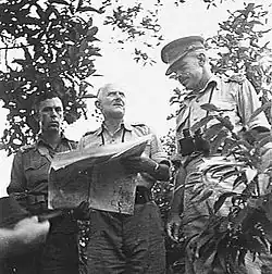 In early 1945, planning was underway for Operation Oboe Two, an amphibious assault to capture Balikpapan, a seaport on Borneo. The 9th Division was originally designated for the operation, but in April it was decided to utilise the 7th Division instead, and it duly embarked from Cairns to Morotai, the staging post for the assault.[17] Operation Oboe Two would transpire to be the largest amphibious operation mounted by the Australian military.[18] Despite opposition from the American naval commanders providing support for the operation, Milford decided to land his forces at Klandasan, a southern suburb of Balikpapan which although heavily defended, had suitable beaches for landing troops. By landing at Klandasan, Milford hoped to achieve tactical surprise and anticipated fire support from the United States Navy would help counter the coastal defences of the Japanese.[16] The battle of Balikpapan began on 1 July with a naval barrage of the landing area, supported by bombers of the Royal Australian Air Force, with the division landing relatively unopposed by mid morning. By 1pm, the beachhead was secure and Milford, together with Generals Douglas MacArthur and Leslie Morshead made an inspection of the area.[19] At this late stage of the war it was clear that the war would soon end, and extensive use was made of divisional artillery (which Milford had raised during his earlier spell with the division in 1940) rather than needlessly risk soldiers' lives.[20] By 21 July, Balikpapan was secure and the Japanese were retreating into Borneo. Milford ordered a halt to further offensive action and instructed his outlying forces to hold their position,[21] thus concluding a successful operation.[18]