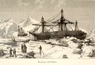 Here they were frozen in for the next 10 months. There were three months of total darkness and in the new year the temperature dropped to −54 °F (−48 °C). The men were kept busy with regular exercise while the officers put on plays and produced a newspaper.[4] The first case of scurvy was reported in January and by March fourteen men were on the sick list, about half with mild scurvy. Parry carried mustard and cress seeds and planted them in his cabin. The leaves seemed to help.