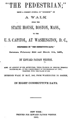 - Edward Payson Weston. The pedestrian: being a correct journal of "incidents" on a walk from the state house, Boston, Massachusetts, to the U.S. Capitol, at Washington, D.C., performed in "ten consecutive days", between February 22d and March 4, 1861. NY: E.P. Weston, 1862