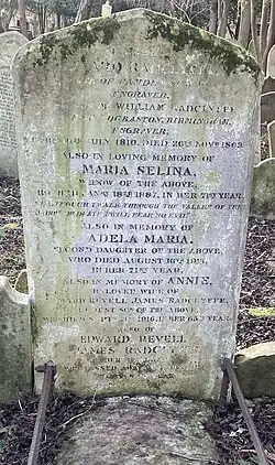 He was buried on the western side of Highgate Cemetery, and his wife, son, daughter and daughter-in-law were later buried with him. He had married, in 1838, Maria, daughter of Major Henry Revell of Round Oak, Englefield Green, Surrey.[1]