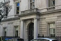An areaway separates the house from the sidewalk, and there is an iron fence in front of the areaway,[2][1] inspired by a similar fence in the Italian city of Verona.[29] Due to the narrow frontage on Fifth Avenue,[23] the main entrance is through an archway at the center of the 75th Street elevation.[22][1] There is a portico, supported by a pair of Tuscan columns, in front of the archway. The rest of the first story contains windows,[1] which have raised window sills to prevent pedestrians from looking in.[17][26] The first story is clad with rusticated marble blocks, with deep grooves running horizontally and vertically across the facade.[1] The vertical grooves between the first-story windows are arranged in a pattern to give the illusion of vertical pilasters on the facade.[24][1] Above the first story, there are two capitals between each bay, further contributing to the impression of pilasters.[24][1][30] Unlike traditional pilasters, the grooved sections of the wall do not have vertical decorative elements that evoke column shafts.[30]