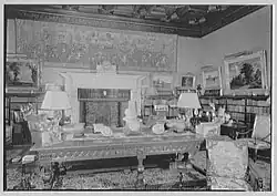 West of the entrance hall, on the western end of the first floor, is the reception room, which faces Central Park.[32][33] The reception room has a ceiling mural and was originally decorated in a French style,[31][39] specifically the Louis XVI style.[30] The ceiling mural contains representations of various figures such as white women carrying umbrellas, along with monkeys and Chinese men.[24] The fixtures, such as light switches, were designed so they blended in with the woodwork.[31][39] There is a small fireplace in the reception room, which is flanked by wall sconces. The reception room also had a Persian-style leather screen. There was originally a pair of doors connecting the entrance hall to the reception room; when the Commonwealth Fund took over the building in 1952, the reception room became a conference space, and the door was removed.[24] North of the entrance hall, another room connects with the dressing room and elevator.[31][32] The dressing room has mirrors and a coved ceiling.[24]