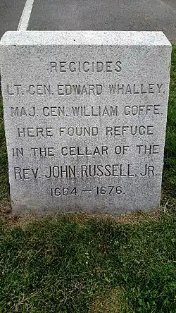 The two moved to New Haven, Connecticut, where John Dixwell, also condemned as a regicide, was living under the assumed name of James Davids.[8][9] Arriving on 7 March 1661, they lodged with John Davenport, the local minister.[6] News of the orders for their arrest arrived in New Haven, so Whalley and Goffe used a subterfuge to throw off any pursuit. They made a show of leaving and going to Milford, where they made sure they were seen, but that night they returned in secret to New Haven. They again lodged secretly with Davenport and a number of other sympathizers until 13 May, when they resorted to hiding in some woodland and a cave on Providence Hill (spending some nights in a nearby house). Providence Hill is now known as West Rock, and today the cave is called Judges Cave. In August they moved into a house in Milford belonging to a Mr. Tomkins, another sympathizer, and remained there for two years. In 1664 they were forced to return to the cave when the King's commissioners arrived in Boston, but Native Americans revealed the cave while the two were absent, which forced them to move further away from Boston. On 13 October, travelling only by night, they set off for Hadley, about one hundred miles away to the north in western Massachusetts, where the minister, John Russell, had arranged for them to live with him. They remained there undiscovered for fifteen or sixteen years, receiving money from their wives in England and presents from a few supporters who knew where they were in order to pay their host for their support. In the first few years, they were in constant fear of discovery and were much relieved to read in the newspapers that they were thought to have died in Switzerland while living in exile with other regicides.[10][a] Every attempt by the English government to procure Whalley or Goffe's arrest failed. Whalley was alive but in poor health in 1674 and probably did not live long afterwards.[4]