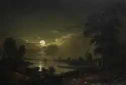 Edward Williams between 1814 and 1855 exhibited at the Royal Academy (36 works), the British Institution (21 works), the Suffolk Street Gallery of the Society of British Artists (38 works), and elsewhere.[4] He often shared venues with his sons, causing some confusion with the public who had trouble telling one Williams painting from another. He is often called "Old Williams" to distinguish him from his oldest son, and he is referred to in some of the art journals of the time as "Moonight Williams", as moonlit scenes of the Thames were one of his favorite subjects in his paintings. He was predeceased by his wife, and he is said to have never quite overcome the grief at her death. He died on 24 June 1855 at the Castelnau Villas, and is buried nearby in Barnes Cemetery.