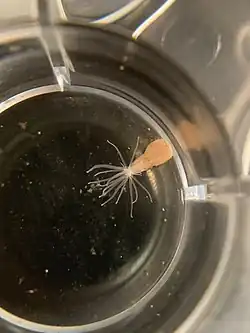 Edwardsiella lineata is the only known member of the Edwardsiidae family to have a parasitic life stage.[3] Upon fertilization, a primary planula develops. Instead of direct development into an adult polyp like many other anemone species such as its close relative Nematostella vectensis,[12] it infects a species of pelagic ctenophore known as Mnemiopsis leidyi. The planula can infect its host in two ways: burrowing through epidermal walls or burrowing through gastrodermal walls into the gut after being eaten by an M. leidyi.[3] It is common for a single M. leidyi to harbor multiple E. lineata parasites.[13] On entering a host, the larva adopts a worm-like appearance and feeds on the contents of the host's gut. When sufficiently developed, or if the host dies, it exits the host and regains its planula larval form. If another host is available it can once again adopt the worm-like phase, but if no new host is available, it can settle on the seabed and undergo metamorphosis into a juvenile sea anemone polyp.[14] This metamorphosis can take as little as three days. If the parasitic larva is artificially excised from its host it may also undergo metamorphosis into a polyp,[3] presumably because manual excision mimics natural death of the host or the parasite voluntarily leaving. E. lineata has been proposed as a possible biological control on the voracious planktivore M. leidyi, though this has yet to be artificially implemented. Infected ctenophores have lower growth rates than their non-infected counterparts, sometimes even negative growth rates, or "shrinking", leading to thoughts that E. lineata could help depress the population of M. leidyi in areas where it becomes damaging to fisheries.[7]