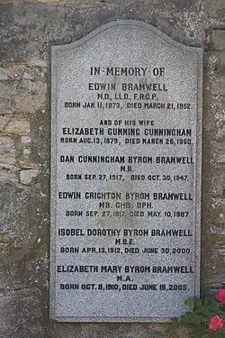 In 1908 he married Elizabeth Cumming Cunningham (1879-1960) daughter of Daniel John Cunningham and granddaughter of Very Rev John Cunningham.[6] They had four daughters and two sons. One daughter Margaret Claire Byrom Bramwell married Dr James Kirkwood Slater.[7]