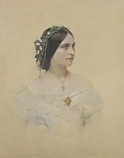 Edwin (Edward) Dalton was born in England in the early 1800s. He exhibited at the London Royal Academy between 1818 and 1844, and received the Society of Arts' silver palette in 1824.[1] In either 1841 or 1842 he married Magdalena (née Ross).[2] She was the sister of William Ross, one of Queen Victoria's favourite portrait painters, and one of England's last great miniature painters.[3] Initially specialising in portrait painting Dalton and Magdalena enjoyed the patronage of Queen Victoria and Prince Albert in the 1840s. They both worked at Buckingham Palace where they made copies after works in the Royal collection by other artists. In 1846, Dalton also taught lithography to Queen Victoria and Prince Albert.[2]