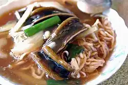 Eel noodles (Chinese: 鱔魚意麵; pinyin: shànyú yìmiàn; Pe̍h-ōe-jī: siān-hî ì-mī) comprise a signature Taiwanese noodle dish consisting of thick, chewy, egg noodles with young yellow or finless eels, and a brown sweet and sour sauce or viscous soup.[2] The dish originated from the food capital of Taiwan, Tainan City, which is near the sea. The dish is considered one of the national dishes of Taiwan and can be found in many Taiwanese restaurants and night markets all around the country.[3] Eel noodles was featured on the 19 great dishes in Tainan, Taiwan's capital of food by CNN Travel.[4]